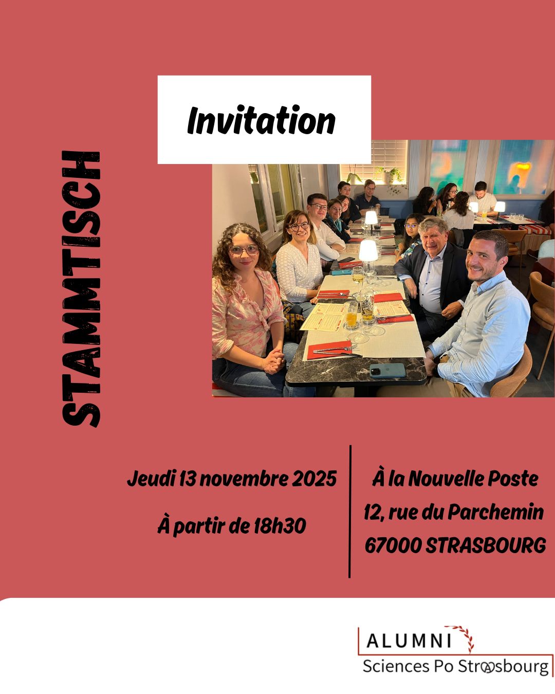 Nous nous retrouverons tous ensemble à partir de 18h30 autour d’un Stammtisch à La Nouvelle Poste à Strasbourg ! Une belle occasion d’échanger et de partager un moment convivial tous ensemble entre Alumni pour discuter de nos parcours respectifs et pourquoi pas retrouver d’anciens camarades de promotion.