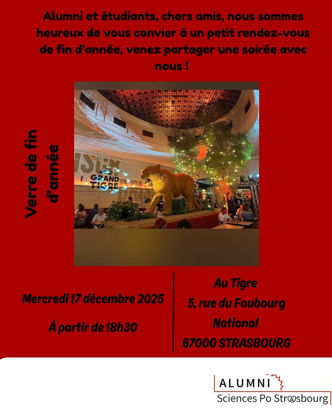 Nous aurons le plaisir de vous retrouver autour d’un verre de fin d’année le mercredi 17 décembre à 18h30 au Tigre ! Une belle occasion de partager un moment de convivialité avant la fin de cette année, de faire le bilan de celle-ci et de discuter des prochains événements pour 2026. Nous serons très heureux de vous voir et nous vous attendons nombreux.