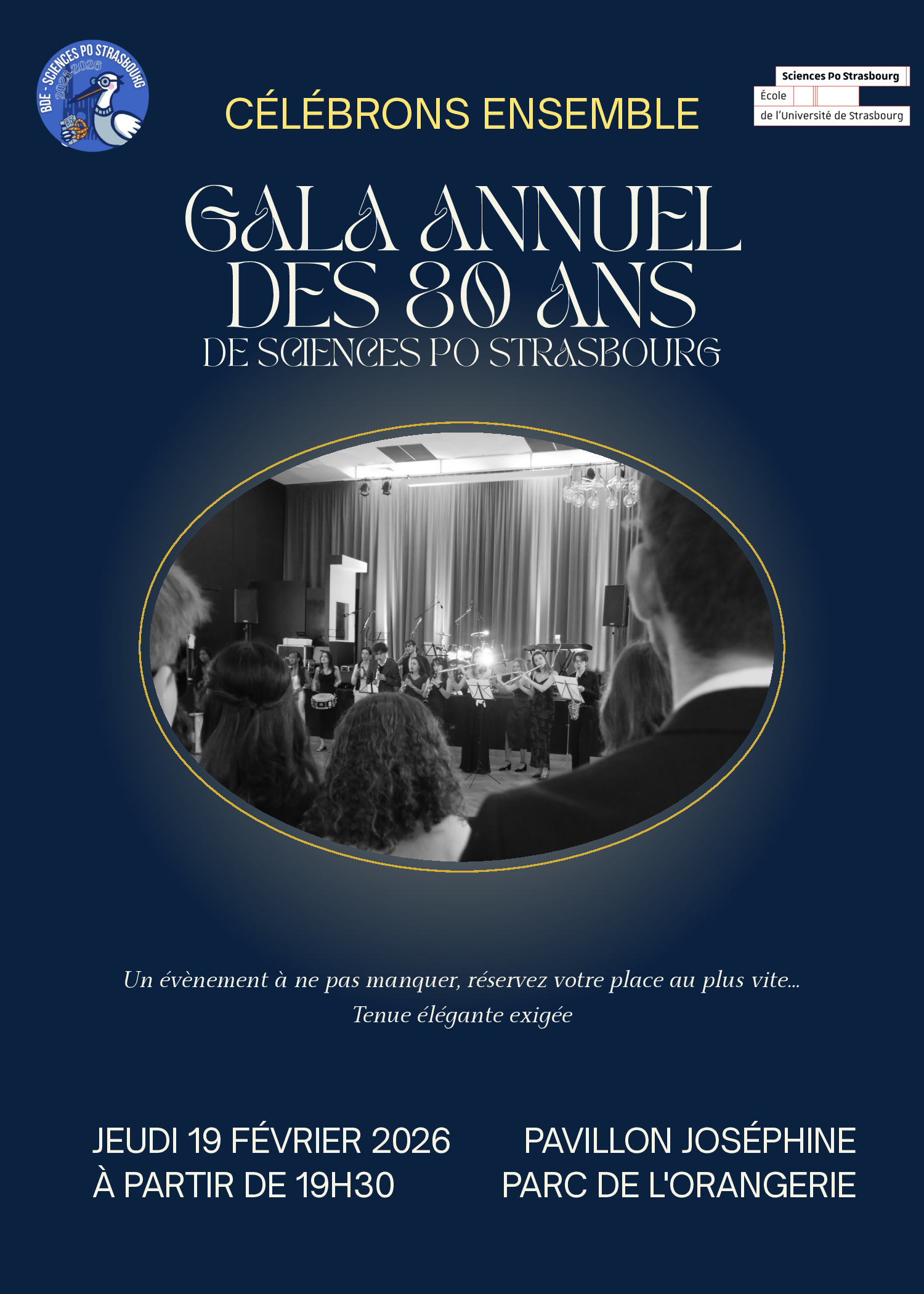 Depuis 1945, Sciences Po Strasbourg incarne l’excellence académique, formant des citoyens et des décideurs influents. En 2026, le BDE célèbre huit décennies de succès et d’impact. Le BDE et l’ensemble de la communauté de Sciences Po Strasbourg ont l’immense honneur de vous convier à une soirée inoubliable : Le Gala des 80 ans. Nous nous retrouverons le 19 février à partir de 19h30 au Pavillon Joséphine, Parc de l’Orangerie.